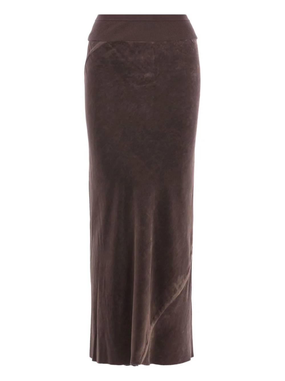 ribbed-waistband draped midi skirt Highlights - Brown - Ribbed waistband - Draped design - Asymmetrical hem - Soft texture Made in Italy Composition Viscose 82%, Silk 18% Lining: Cotton 70%, Nylon 30% Washing instructions Read Manufacturer Guidelines