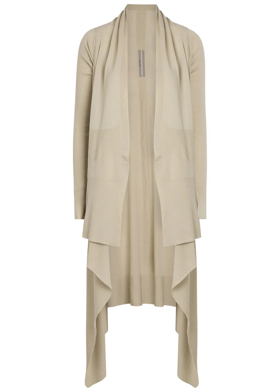 Info & Care Rick Owens wool cardigan Stand collar, ribbed sleeves, asymmetric hem, ribbed trims, open front Slips on 100% virgin wool Hand wash Size & Fit Length shoulder to hem: 1: 32 inches/ 81.5cm; 2: 51 inches/ 129.5cm Midweight Regular fit Model is 5'10"/ 178cm and wears a size small