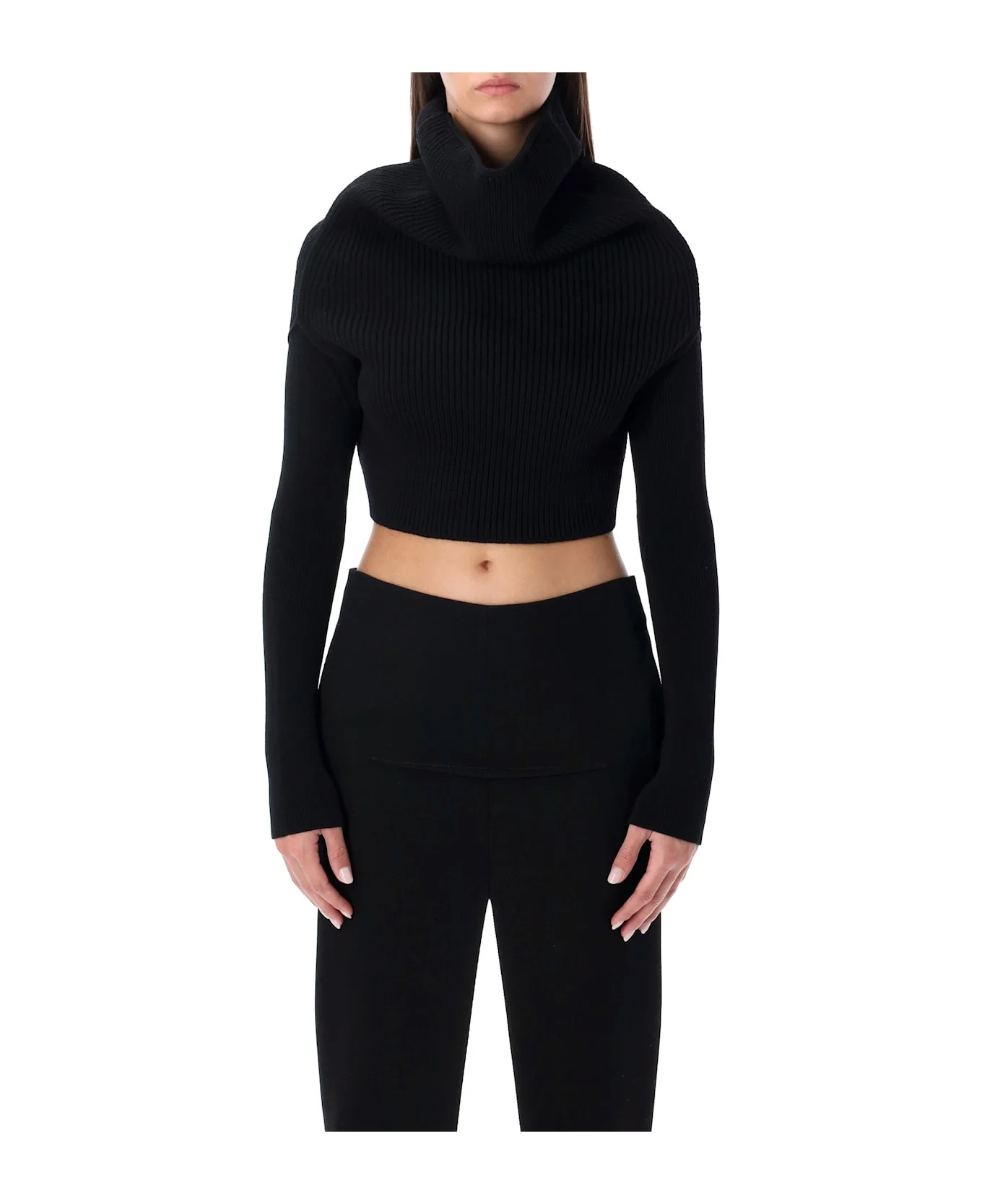 A Bold Rick Owens Statement Piece, This Long-sleeved Knit Features A Sculptural Ribbed Texture And A Dramatic Oversized Cowl Neck. Cut Short Above The Waistline, Its Fitted Silhouette Creates A Strong And Sensual Impact, Making It Perfect For Layering In Directional Looks. Cropped Ribbed Knit Top Oversized Draped Cowl Neck Long Sleeves Slim Fit Alessandra Is 1,75 M And Wears Size S Composition: 100% new wool Made in: Italy Color: BLACK Model number: RO02E4675KWVH09