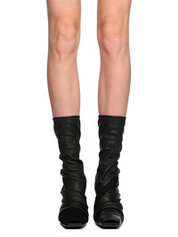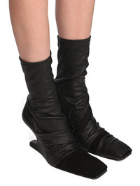 RICK OWENS FW25 CONCORDIANS CANTILEVER 8 SOCK IN BLACK/BLACK STRETCH LAMB LEATHER, SUEDE LEATHER AND RAININO JERSEY THIS CANTILEVER 8 SOCK IS AN ABOVE-ANKLE HEIGHT STRETCH SOCK BOOT WITH A SQUARE, SLIGHTLY OPEN TOE AND A 8CM CANTILEVERED HEEL THIS IS A COMBINATION OF STRETCH LAMB LEATHER, SUEDE LEATHER AND RAININO JERSEY THIS STRETCH LAMB LEATHER HAS A SMALL GRAIN TEXTURE AND MATTE FINISH THIS LEATHER IS MADE BY A SECOND GENERATION FAMILY OWNED TANNERY IN THE SOUTH OF FRANCE SPECIALIZING ONLY IN STRETCH LEATHER PRODUCTION. EACH SKIN IS STRETCHED OUT TO ITS LIMIT AND BONDED TO A COTTON AND LYCRA FABRIC BACKING. WHEN DYED, THE HEAT OF THE PROCESS ACTIVATES THE LYCRA ELASTIC FIBRES THAT SHRINK THE FABRIC AND WITH IT THE SKIN, BACK TO ITS ORIGINAL SIZE. THE LEATHER THEN EXITS THE PROCESS AS STRETCH COLOR: BLACK/BLACK MATERIAL: UPPER 65% LAMB LEATHER + 34% COTTON + 1% SPANDEX DETAIL 100% CALF LEATHER LINING 100% GOAT LEATHER INSOLE 100% CALF LEATHER SOLE 100% COW LEATHER SOLE DETAIL 100% THERMOPLASTIC POLYURETHANE HEEL HEIGHT 8CM