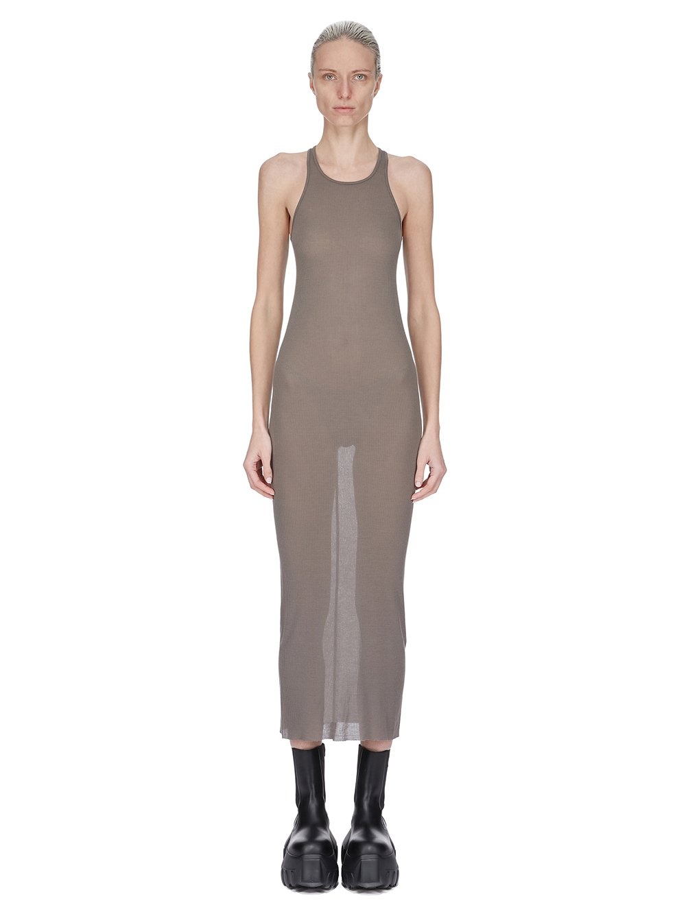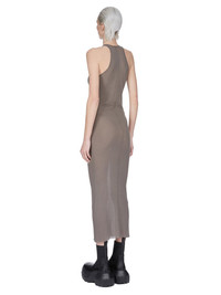 RICK OWENS SS25 HOLLYWOOD TANK DRESS IN DUST VISCOSE SILK RIB JERSEY THIS TANK DRESS IS BELOW-KNEE LENGTH WITH A CLOSE TO THE BODY FIT. IT HAS A ROUND NECKLINE AND THIN SHOULDER STRAPS THAT FLOW INTO A SLIGHT RACER BACK. IT HAS A RAW CUT HEM AND FEATURES THE SIGNATURE SINGLE SEAM RUNNING DOWN THE CENTER BACK SPINE THIS LIGHTWEIGHT VISCOSE AND SILK RIB JERSEY HAS A DISTINCT RIB PATTERN AND SOFT HANDFEEL.THIS JERSEY IS MADE FROM FSC® CERTIFIED VISCOSE WHICH ENSURES THAT THE FIBERS ARE PRODUCED FROM RESPONSIBLY MANAGED SOURCES AND NO DEFORESTATION OCCURS WE STRIVE TO KEEP OUR PRODUCTION AS LOCAL AS POSSIBLE. THE FULL MANUFACTURING CYCLE OF THIS PRODUCT, FROM THE MATERIAL KNITTING TO SEWING AND FINISHING, WAS UNDERTAKEN CLOSE TO OUR HOME BASE IN CONCORDIA, ITALY COLOR: DUST MATETIAL: 88% VISCOSE + 12% JERSEY MODEL IS 181CM TALL MODEL WEARS SIZE 40