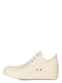 RICK OWENS SS25 HOLLYWOOD RUNWAY LOW SNEAKS IN MILK/MILK/MILK WASHED CALF THESE LOW SNEAKS ARE UNDER-ANKLE HEIGHT, RISING AT THE BACK AND FEATURE SIX EYELETS, LACES, TOE CAPS AND SHARK -TOOTHED BUMPER SOLES HIS MEDIUMWEIGHT COW LEATHER IS VEG TANNED AND FINISHED USING NATURAL WAXES. A FINAL WASH GIVES THIS LEATHER ITS SOFTNESS AND BRINGS OUT THE NATURAL GRAIN TEXTURE OF EACH SKIN. BECAUSE THIS SKIN IS NAKED, NOT FINISHED USING ANY PIGMENTS COVERING THE SKIN, NATURAL MARKINGS AND SHADINGS ARE VISIBLE WHICH MAKES EACH SKIN AND PRODUCT UNIQUE. VEG TANNING MEANS ONLY VEGETAL AND NATURAL TANNINS WERE USED IN THE PROCESS OF TANNING AND PRESERVING THIS LEATHER.THIS TANNERY IS LWG CERTIFIED WITH A SILVER RATING COLOR: MILK/MILK/MILK MATERIAL: UPPER 100% CALF LEATHER LINING 100% CALF LEATHER INSOLE 100% CALF LEATHER SOLE 100% THERMOPLASTIC RUBBER