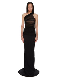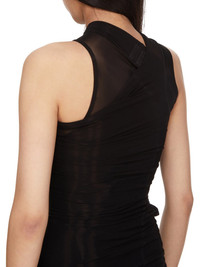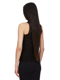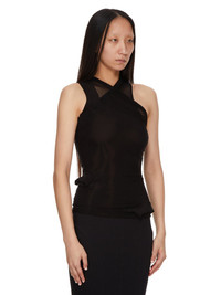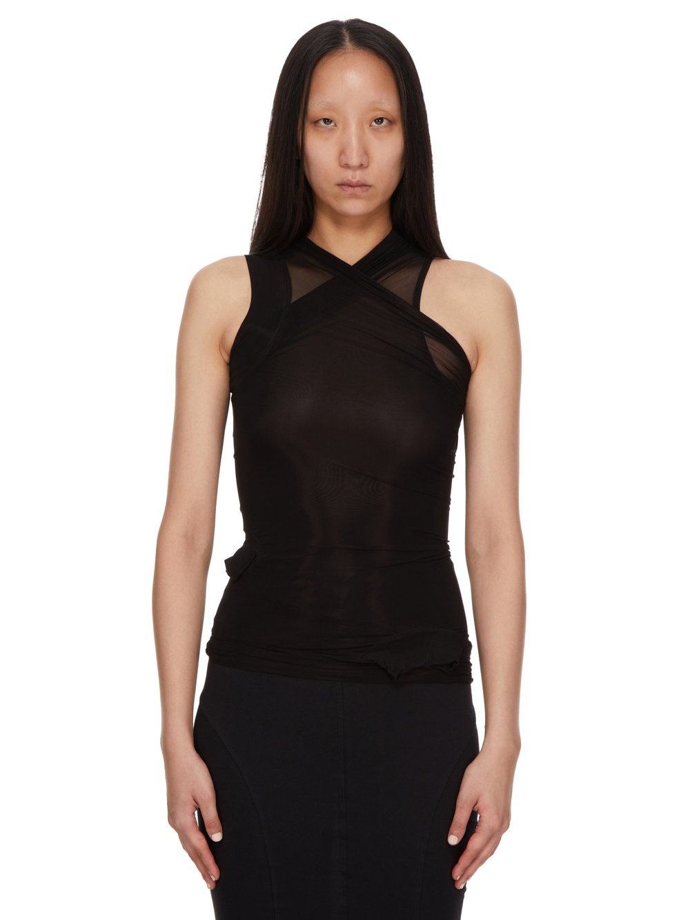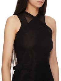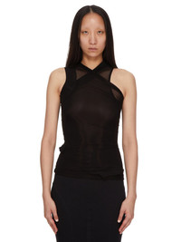 RICK OWENS SS25 HOLLYWOOD RUNWAY HOLLYWOOD BANANA T IN BLACK STRETCH CUPRO JERSEY THIS HOLLYWOOD BANANA T IS ABOVE-HIP LENGTH AND SLEEVELESS. IT HAS AN UNDER LAYER WITH TWO ROUND HOLES WITH RIBBED EDGES, AND AN OUTER LAYER THAT FOLDS UP TO CREATE A CRISS-CROSS DRAPED NECK FRONT AND BACK THIS LIGHTWEIGHT AND SEMI TRANSPARENT CUPRO JERSEY IS STRETCHY WITH A SOFT AND COOL HANDFEEL THIS JERSEY IS MADE USING CUPRO WHICH IS BIODEGRADABLE AND 100% PLANT BASED. AS IT’S MADE FROM COTTON WASTE, CUPRO HELPS FIND A PURPOSE TO FIBERS THAT WOULD OTHERWISE BE DISCARDED COLOR: BLACK MATERIAL: 92% CUPRO + 8% ELASTANE MODEL IS 181CM TALL MODEL WEARS SIZE 40