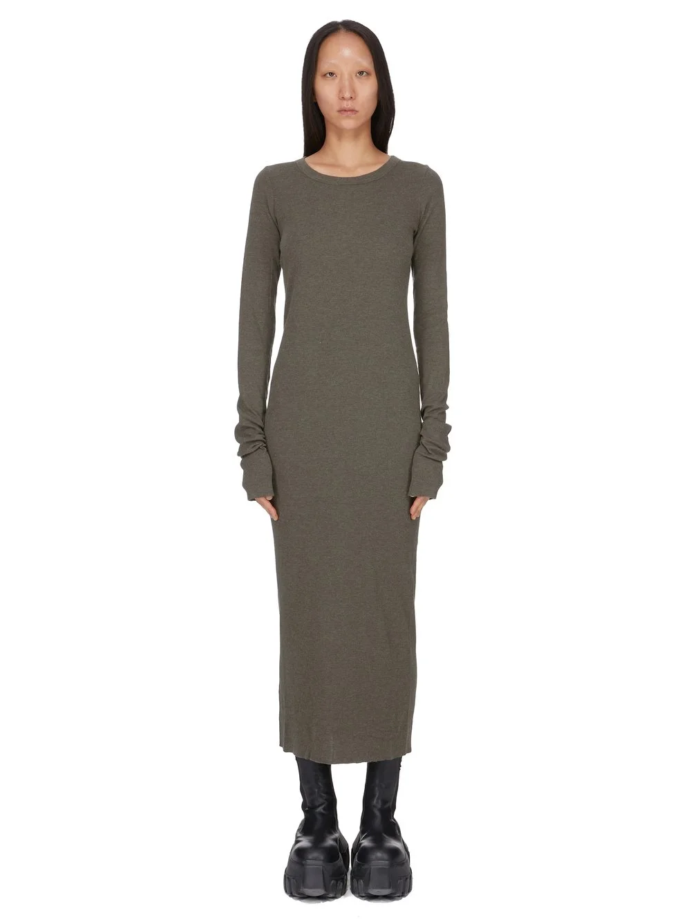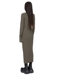 RICK OWENS FW25 CONCORDIANS RIB LS DRESS IN RAININO RIB JERSEY THIS RIB LS DRESS IS MID CALF LENGTH WITH A SLIM FIT AND LONG SLEEVES. IT HAS A RIBBED ROUND NECK, RAW CUT HEM AND CUFF. IT FEATURES THE SIGNATURE SINGLE SEAM RUNNING DOWN CENTRE BACK SPINE THIS MEDIUMWEIGHT AND FLUID VISCOSE AND WOOL BLEND JERSEY HAS A SOFT, WARM HANDFEEL AND A SLIGHTLY HAIRY SURFACE TEXTURE. WE STRIVE TO KEEP OUR PRODUCTION AS LOCAL AS POSSIBLE. THE FULL MANUFACTURING CYCLE OF THIS PRODUCT, FROM THE MATERIAL KNITTING TO SEWING AND FINISHING, WAS UNDERTAKEN CLOSE TO OUR HOME BASE IN CONCORDIA, ITALY. THIS JERSEY IS MADE FROM CERTIFIED VISCOSE AND RWS CERTIFIED WOOL. COLOR: BOSCO MATERIAL: 30% VISCOSE + 30% NYLON + 20% ANGORA + 20% WOOL MODEL IS 181CM TALL MODEL WEARS SIZE 40