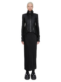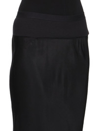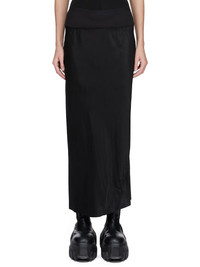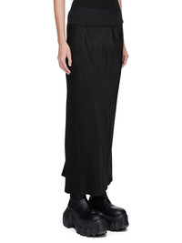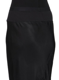 RICK OWENS FW25 CONCORDIANS CALF BIAS SKIRT IN BLACK WASHED CUPRO THIS CALF BIAS SKIRT IS LOW-CALF LENGTH WITH A WIDE RIBBING AND ELASTICIZED WAISTBAND. IT FLARES SLIGHT FROM THE KNEE FEATURES A DIAGONAL BIAS CUT SEAM WITH DRAPED INSERT AT LEFT BACK THIS MEDIUMWEIGHT WASHED CUPRO SATIN IS FLUID AND FINISHED WITH ENZYMES WHICH GIVES THIS FABRIC ITS PEACH HANDFEEL THIS FABRIC IS MADE USING CUPRO WHICH IS BIODEGRADABLE AND 100% PLANT BASED. AS IT’S MADE FROM COTTON WASTE, CUPRO HELPS FIND A PURPOSE TO FIBERS THAT WOULD OTHERWISE BE DISCARDED COLOR: BLACK MATERIAL: 100% CUPRO BAND 65% COTTON + 35% NYLON MODEL IS 181CM TALL MODEL WEARS SIZE 40