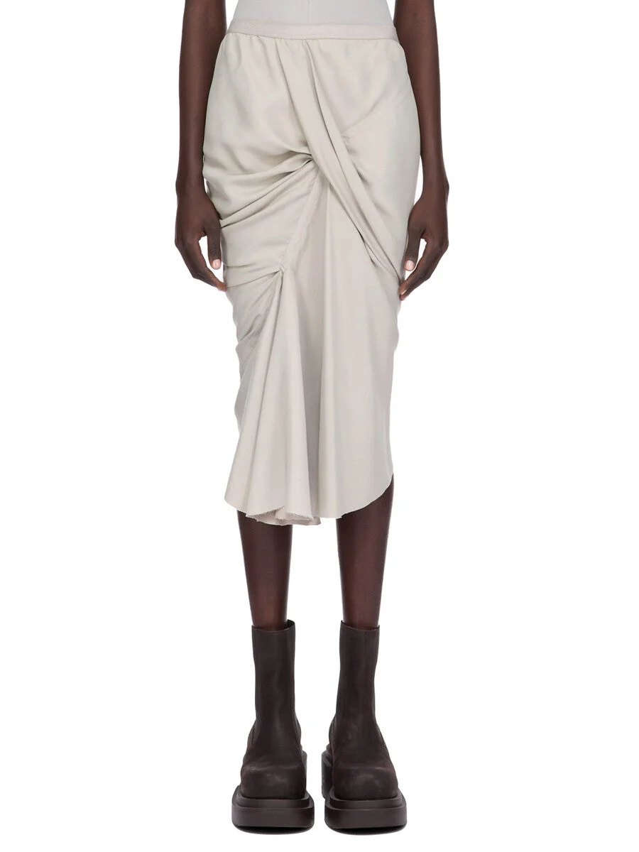 RICK OWENS FW25 CONCORDIANS SEB SKIRT IN PEARL WASHED CUPRO THIS SEB SKIRT IS BELOW-KNEE LENGTH AT FRONT AND KNEE LENGTH AT BACK. IT HAS AN ELASTICIZED WAISTBAND. IT GATHERS IN THE FRONT, AND HAS A DRAPED BIAS CUT FROM WHICH SLIGHT FOLDS FALL TO THE FRONT HEM. THIS MEDIUMWEIGHT WASHED CUPRO SATIN IS FLUID AND FINISHED WITH ENZYMES WHICH GIVES THIS FABRIC ITS PEACH HANDFEEL. THIS FABRIC IS MADE USING CUPRO WHICH IS BIODEGRADABLE AND 100% PLANT BASED. AS IT’S MADE FROM COTTON WASTE, CUPRO HELPS FIND A PURPOSE TO FIBERS THAT WOULD OTHERWISE BE DISCARDED. COLOR: PEARL MATERIAL: 100% CUPRO MODEL IS 181CM TALL MODEL WEARS SIZE 40