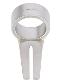RICK OWENS OPEN TRUNK RING IN BRASS THIS OPEN TRUNK RING IS A THICK BAND WHICH EXTENDS INTO A GEOMETRIC TRUNK SHAPE WITH AN OPEN FACE CENTRE SLIT AND BEVELED EDGES AND THE RICK OWENS LOGO ENGRAVED ON THE BACK. THESE JEWELLERY PIECES ARE CRAFTED WITH THE INDIVIDUAL HANDWORK OF THE ARTISAN, MAKING EACH PIECE UNIQUEBRASS METAL WITH A BRUSHED PALLADIUM FINISH - COLOR: PALLADIO - MATERIAL: 100% BRASS