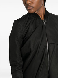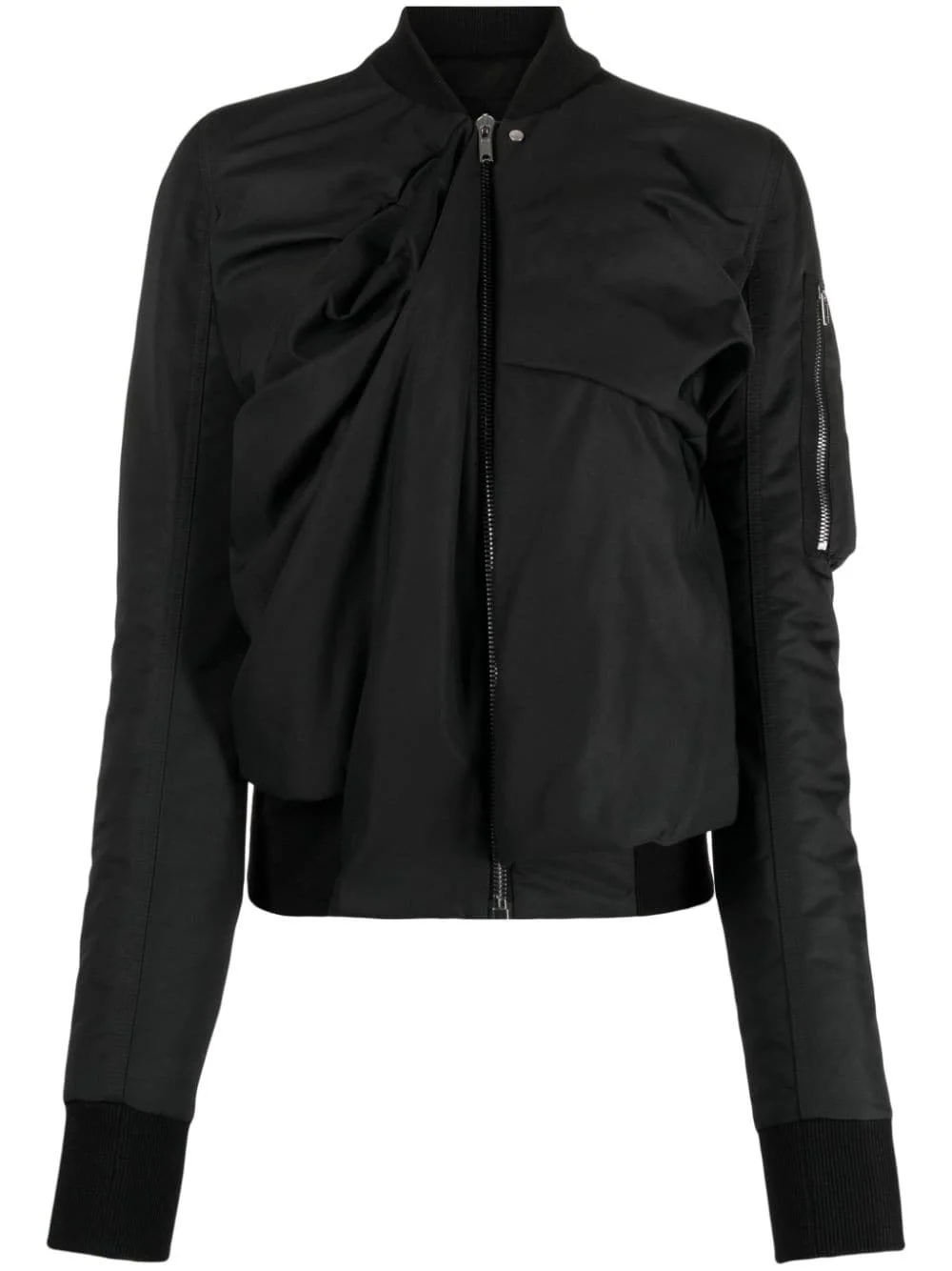 Ripple draped bomber jacket Highlights - Black - Draped design - Silver-tone logo plaque - Pleat detailing - Silver-tone hardware - Ribbed band collar - Front zip fastening - Long sleeves - Sleeve zip pocket - Internal zip-fastening pockets - Ribbed cuffs and hem - Full lining Made in Italy Composition Outer: Recycled Polyester 100%, Wool 100%, Buffalo Horn 100% Lining: Cotton 100%, Cupro 100%, Polyester 100% SIZE & FIT Model measurements Height 5 ft 10 in(1.77 m) Bust/Chest 34.64 in(88 cm) Hips 35.43 in(90 cm) Waist 24.8 in(63 cm) Washing instructions Dry Clean Only
