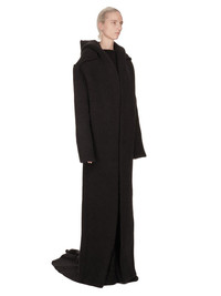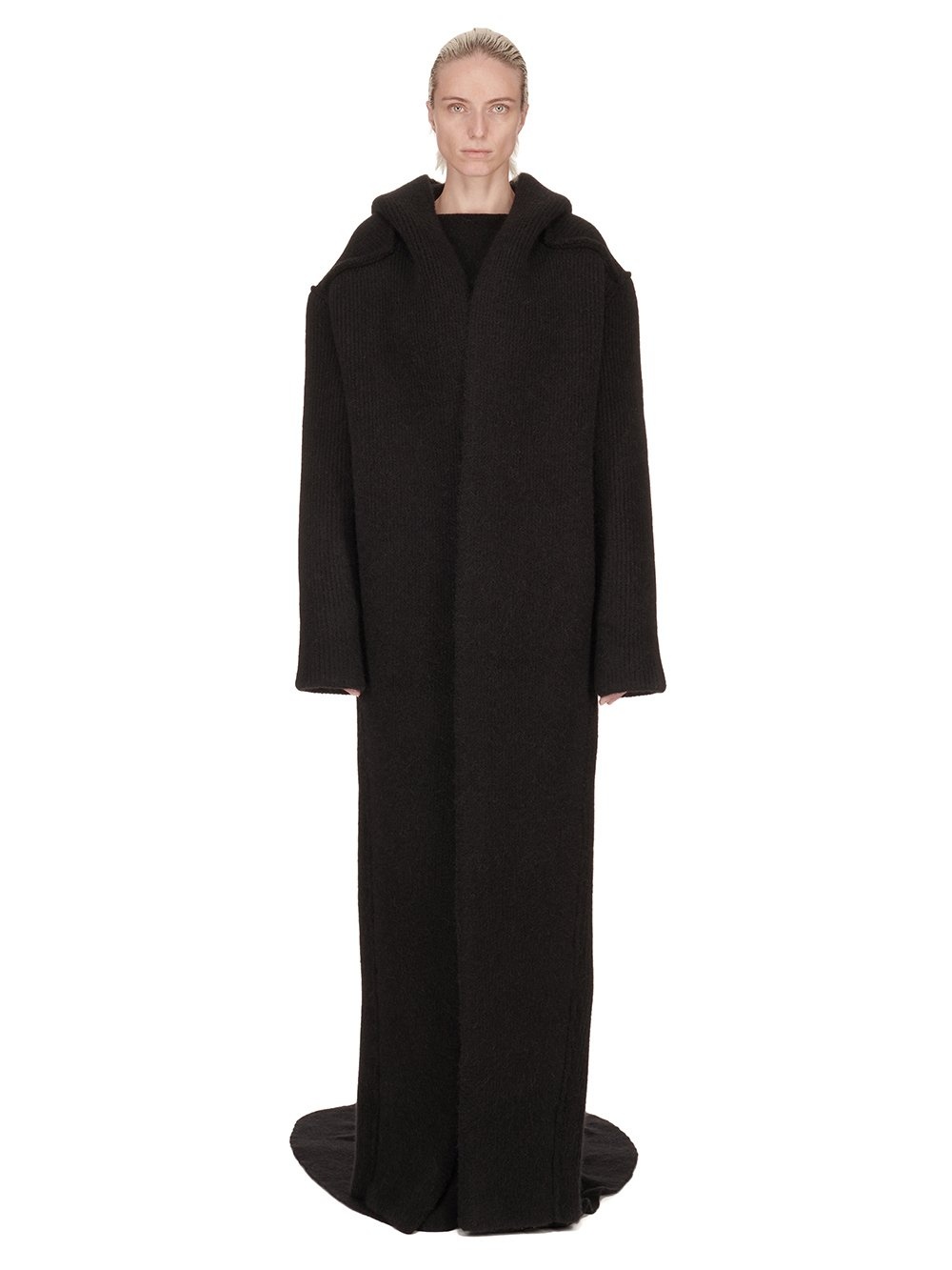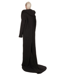 RICK OWENS FW24 PORTERVILLE HOODED ROBE IN BLACK MEGA HEAVY ALPACA KNIT THIS HOODED ROBE IS FLOOR LENGTH, WITH LONG LOOSE SLEEVES. IT HAS A HOOD AND AN OPEN FRONT, LEVEL SHOULDER SEAMS AND A CENTRE BACK VENT THIS MEGA HEAVY WEIGHT ALPACA BLEND KNIT IS COMPACT WITH A SOFT AND BRUSHED HANDFEEL - COLOR: BLACK - MATERIAL: 48% ALPACA + 30% NYLON + 20% WOOL + 2% ELASTANE - MODEL IS 181CM TALL - MODEL WEARS SIZE S