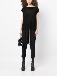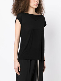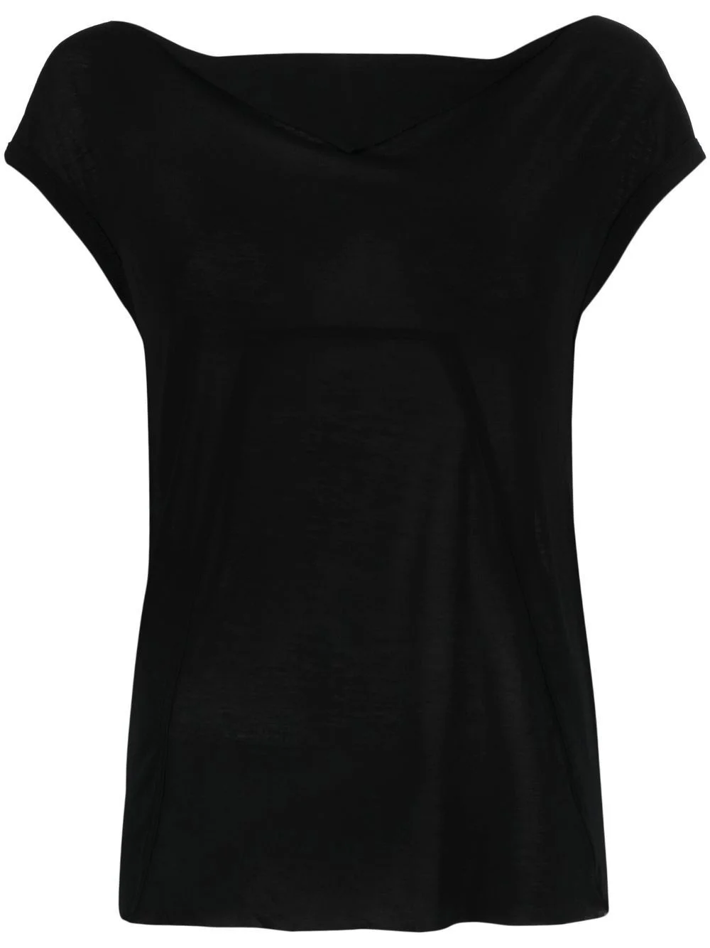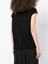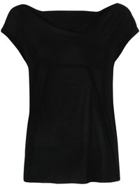 round neck short-sleeved T-shirt black semi-sheer construction crew neck short sleeves straight hem Made in Italy Composition Viscose 88%, Silk 12% SIZE & FIT Model measurements Height 5 ft 10 in(1.78 m) Bust/Chest 33.46 in(85 cm) Hips 35.43 in(90 cm) Waist 24.4 in(62 cm) FittingInformation This piece fits true to size. We recommend you get your regular size Cut for a loose fit Made with a lightweight fabric