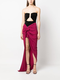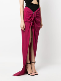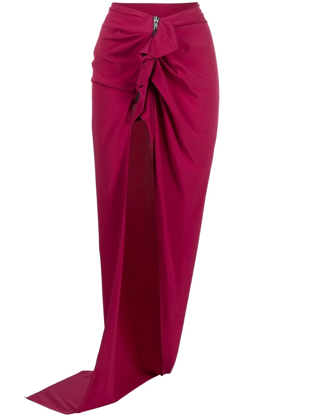ruffle-trim draped maxi skirt Reminiscent of the way beach sarongs tie at the front, Rick Owens' maxi skirt has a gathered design topped with ruffles and and a slit that stops at the thigh. The burgundy hue lends a burst of bold colour. Highlights - Burgundy - High-waisted - Front zip fastening - Ruffled detailing - Front slit Made in Italy Composition Acetate 64%, Silk 36% SIZE & FIT Model measurements Height 5 ft 11 in(1.8 m) Bust/Chest 31.49 in(80 cm) Hips 36.22 in(92 cm) Waist 25.59 in(65 cm) Measurement HIPS 34.64 in(88 cm) LENGTH 52.75 in(134 cm) WAIST 32.28 in(82 cm) FittingInformation Designed with an asymmetric hem, this skirt is intended to be worn low on the hips Particularly long in length; consider your own measurements Made from a midweight non-stretch fabric This piece fits true to size – take your usual size Washing instructions Dry Clean Only