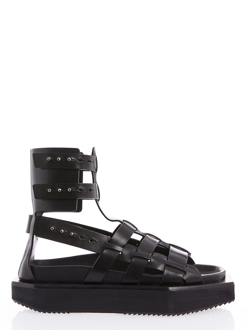 RICK OWENS SS22 FOGACHINE TURBO CYCLOPS SANDAL IN WAXY CALF LEATHER THESE TURBO CYCLOPS SANDALS ARE ANKLE HEIGHT AND FEATURE THREE WIDE LEATHER STRAPS ACROSS THE FOOT, AN ADJUSTABLE LEATHER STRAP ON THE SIDE ANKLE WITH METAL RIVET CLOSURE DETAILS AND A TWO STRAP HIGH ANKLE CUFF WITH METAL CLOSURE. THEY HAVE A ROUNDED TOE, WITH A SCULPTED FOOTBED LAYERED ATOP AN EXTRA CYCLOPS SQUARE TOE OUTER SOLE - COLOR: BLACK - MATERIAL:UPPER 100% CALF LEATHER - PLANTAR FACING 100% LAMB LEATHER - MID SOLE 100% COW LEATHER - SOLE 100% EVA