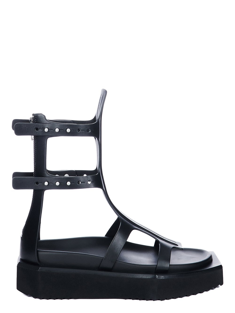 RICK OWENS SS23 EDFU TURBO CYCLOPS SPARTAN LOW IN BLACK FULL GRAIN CALF LEATHER THESE ANKLE HIGH SPARTANS ARE OPEN TOE SANDALS. THEY FEATURE A SHIELD-LIKE FRONT PANEL AND A BACK COVERED HEEL WHICH IS ATTACHED WITH STRAPS. THE TWO ANKLE STRAPS ARE ADJUSTABLE WITH METAL RIVET CLOSURES. THEY FEATURE A CYCLOPS SOLE WITH A RUBBER MEGA CREEPER SOLE LAYERED ATOP A SQUARE TOED OUTER SOLE THIS FULL GRAIN CALF LEATHER HAS A SEMI-SHINE FINISH - COLOR: BLACK - MATERIAL: UPPER 100% CALF LEATHER - LINING 100% CALF LEATHER - PLANTAR FACING 100% CALF LEATHER - SOLE 100% E.V.A