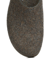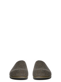 RICK OWENS FW25 CONCORDIANS MULE GRANOLAS IN BOSCO RUGGED WOOL THESE MULE GRANOLAS ARE SLIP ON WITH A COVERED FOOT UP TO THE BRIDGE, AND AN OPEN BACK. THEY HAVE A GRANOLA SCULPTED FOOTBED AND A SHARK-TOOTHED SOLE. THIS HEAVYWEIGHT AND RUGGED WOOL MELTON IS COMPACT WITH A DRY HANDFEEL. IT IS MADE FROM BRITISH WOOL BLENDED WITH KEMP, ALSO KNOWN AS DEAD HAIR. KEMP FIBERS ARE NATURAL TO SOME SHEEP BREEDS AND DO NOT TAKE DYE. COLOR: BOSCO MATERIAL: UPPER 100% WOOL LINING 100% CALF LEATHER PLANTAR FACING 100% CALF LEATHER SOLE 100% COW LEATHER SOLE DETAIL 100% RUBBER