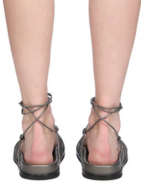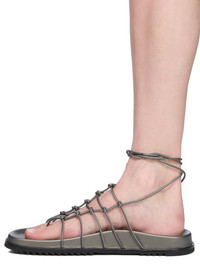 RICK OWENS SS25 HOLLYWOOD WEB GRANOLA IN GUNMETAL METALLIC PEACHED LAMBSKIN THESE WEB GRANOLAS HAVE AN OPEN UPPER MADE FROM SLIM LEATHER STRAPS THAT START BETWEEN EACH TOE, AND KNOT TOGETHER TO FORM A SQUARE WEB OVER THE FOOT. THEY FINISH WITH TWO STRINGS WRAPPING AROUND THE ANKLE AND THEY HAVE A GRANOLA SCULPTED FOOTBED AND A SHARK-TOOTH SOLE THIS LIGHTWEIGHT LAMB LEATHER HAS A SOFT HANDFEEL ACHIEVED BY TUMBLING THE SKINS MULTIPLE TIMES IN A LARGE DRUM. IT IS FINISHED WITH A GUN METAL METALLIC SPRAY FINISH.THIS TANNERY IS LWG AUDITED COLOR: GUNMETAL MATERIAL: UPPER 100% LAMB LEATHER PLANTAR FACING 100% LAMB LEATHER SOLE 100% COW LEATHER SOLE DETAIL 100% RUBBER