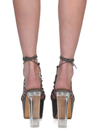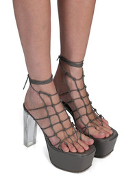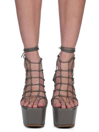 RICK OWENS SS25 HOLLYWOOD RUNWAY WEB PLATFORM 65 IN DUST/CLEAR PEACHED LAMBSKIN THIS WEB PLATFORM 65 IS AN OPEN UPPER, PLATFORM SHOE. ITS UPPER IS MADE FROM SLIM LEATHER STRAPS THAT START BETWEEN EACH TOE, AND KNOT TOGETHER TO FORM A SQUARE WEB OVER THE FOOT. IT FINISHES WITH TWO STRINGS THAT WRAP THE ANKLE THIS LIGHTWEIGHT LAMB LEATHER HAS A SOFT AND NATURAL HANDFEEL ACHIEVED BY TUMBLING THE SKINS MULTIPLE TIMES IN A LARGE DRUM COLOR: DUST/CLEAR MATERIAL: UPPER 100% LAMB LEATHER INSOLE 100% CALF LEATHER SOLE 100% COW LEATHER SOLE DETAIL 100% THERMOPLASTIC POLYURETHANE HEEL 13CM / PLATFORM 6,5CM / RISE 6,5CM
