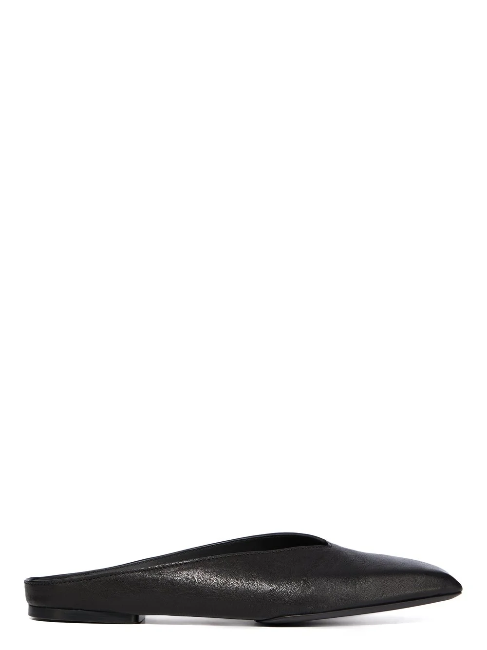 RICK OWENS SS26 TEMPLE BALLERINA MULE IN BLACK WASHED LAMB THESE BALLERINA MULE ARE A FLAT HEELED, OPEN-BACK, SLIP-ON SHOE WITH A SQUARE TOE THIS MEDIUMWEIGHT LAMB LEATHER HAS A NATURAL GRAIN TEXTURE AND A WAXY HANDFEEL TANNED IN THE NAPLES AREA OF ITALY, THIS LEATHER IS TUMBLED MULTIPLE TIMES IN A LARGE DRUM IN ORDER TO BRING OUT THE NATURAL GRAIN TEXTURE OF THE SKIN. THE LEATHER IS FINISHED WITH NATURAL WAXES IN ORDER TO ACHIEVE THE NATURAL AND WAXY HANDFEEL. BECAUSE THIS SKIN IS NAKED, NOT FINISHED USING ANY PIGMENTS COVERING THE SKIN, NATURAL MARKINGS AND SHADINGS ARE VISIBLE WHICH MAKES EACH SKIN AND PRODUCT UNIQUE VEG TANNING MEANS ONLY VEGETAL AND NATURAL TANNINS WERE USED IN THE PROCESS OF TANNING AND PRESERVING THIS LEATHER THIS TANNERY IS LWG CERTIFIED WITH A GOLD RATING COLOR: BLACK MATERIAL:UPPER 100% RAM LEATHER LINING 100% CALF LEATHER INSOLE 100% CALF LEATHER SOLE 100% COW LEATHER