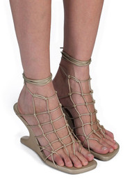 RICK OWENS SS25 HOLLYWOOD RUNWAY WEB CANTILEVER IN GOLD METALLIC PEACHED LAMBSKIN THIS WEB CANTILEVER IS A SANDAL WITH AN OPEN UPPER, MADE FROM SLIM LEATHER STRAPS THAT START BETWEEN EACH TOE, AND KNOT TOGETHER TO FORM A SQUARE WEB OVER THE FOOT. IT FINISHES WITH TWO STRINGS THAT WRAP THE ANKLE AND HAS A SOLE WITH A SQUARE TOE AND AN 8CM CANTILEVER HEEL THIS LIGHTWEIGHT LAMB LEATHER HAS A SOFT HANDFEEL ACHIEVED BY TUMBLING THE SKINS MULTIPLE TIMES IN A LARGE DRUM. IT IS FINISHED WITH A GUN METAL METALLIC SPRAY FINISH COLOR: GOLD MATERIAL: UPPER 100% LAMB LEATHER INSOLE 100% CALF LEATHER SOLE 100% COW LEATHER SOLE DETAIL 100% THERMOPLASTIC POLYURETHANE HEEL 10CM