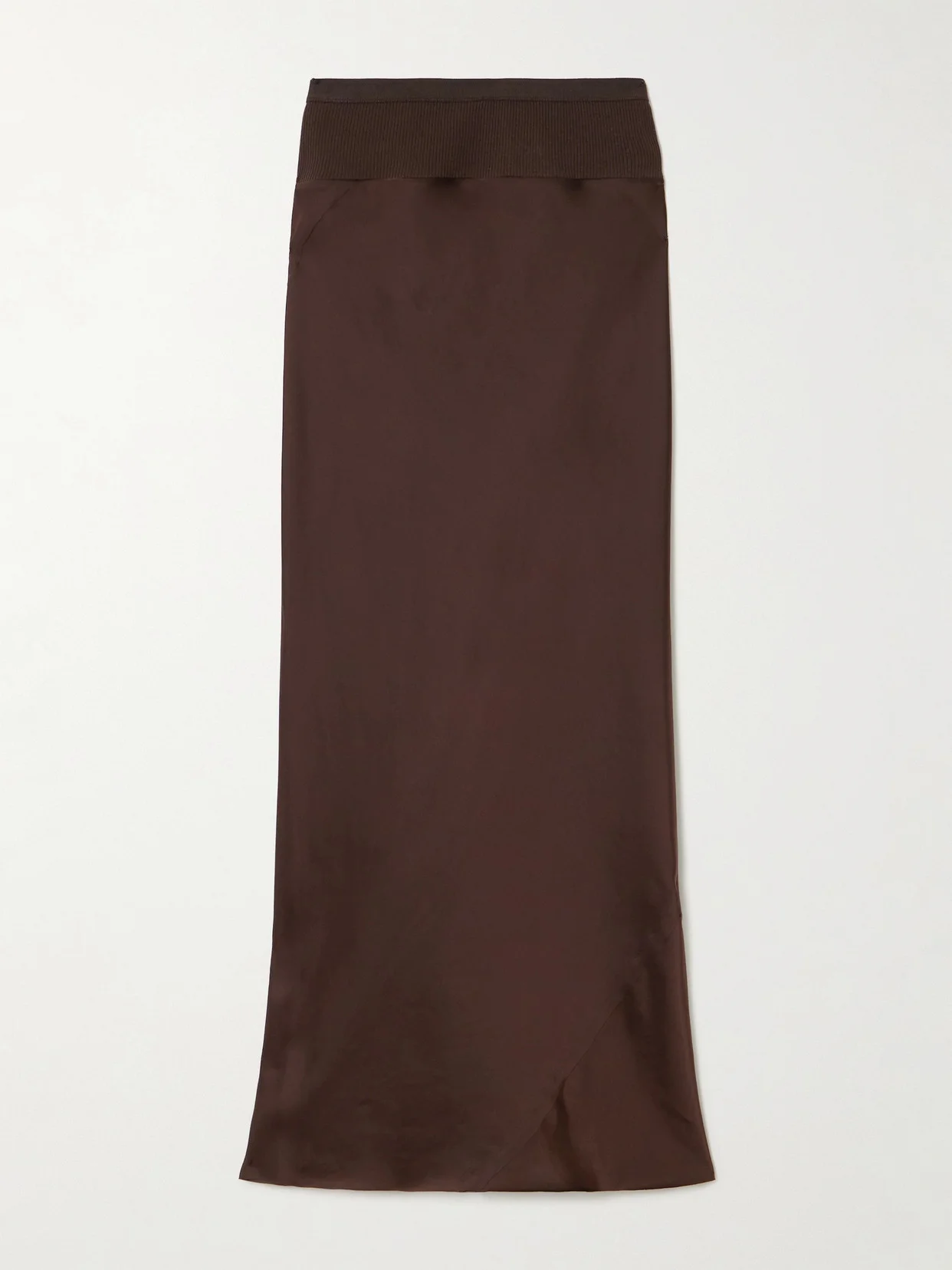 Rick Owens updates the classic slip skirt with a ribbed cotton-blend panel along the elasticated waistband, adding subtle textural contrast. It's made from lustrous charmeuse that's cut on the bias and has a godet back for floaty movement.
