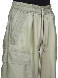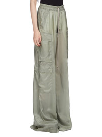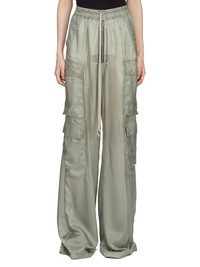 RICK OWENS SS25 HOLLYWOOD CARGOBELAS PANTS IN CELADON WASHED CHARMEUSE THESE CARGOBELAS PANTS ARE FULL-LENGTH WITH A LOW CROTCH AND WIDE LEG. THEY FEATURE AN ELASTICIZED WAISTBAND WITH DRAWSTRING AND A BELA EXPOSED CENTER ZIPPER WITH TWO SNAP DETAIL AT BOTTOM THEY HAVE SIDE WELT POCKETS WITH RIVET AND EYELET DETAIL, FOUR BEVELED CARGO POCKETS ON THE SIDE LEG AND TWO REAR WELT POCKETS WITH CONCEALED SNAPS AND TOPSTITCHING THIS LIGHTWEIGHT AND FLUID CHARMEUSE HAS A SEMI-SHINY SURFACE AND WASHED FINISH. THIS FABRIC IS MADE FROM CERTIFIED VISCOSE WHICH ENSURES THAT THE FIBERS ARE PRODUCED FROM RESPONSIBLY MANAGED SOURCES AND NO DEFORESTATION OCCURS COLOR: CELADON MATERIAL: 61% ACETATE + 39% VISCOSE MODEL IS 181CM TALL MODEL WEARS SIZE 40