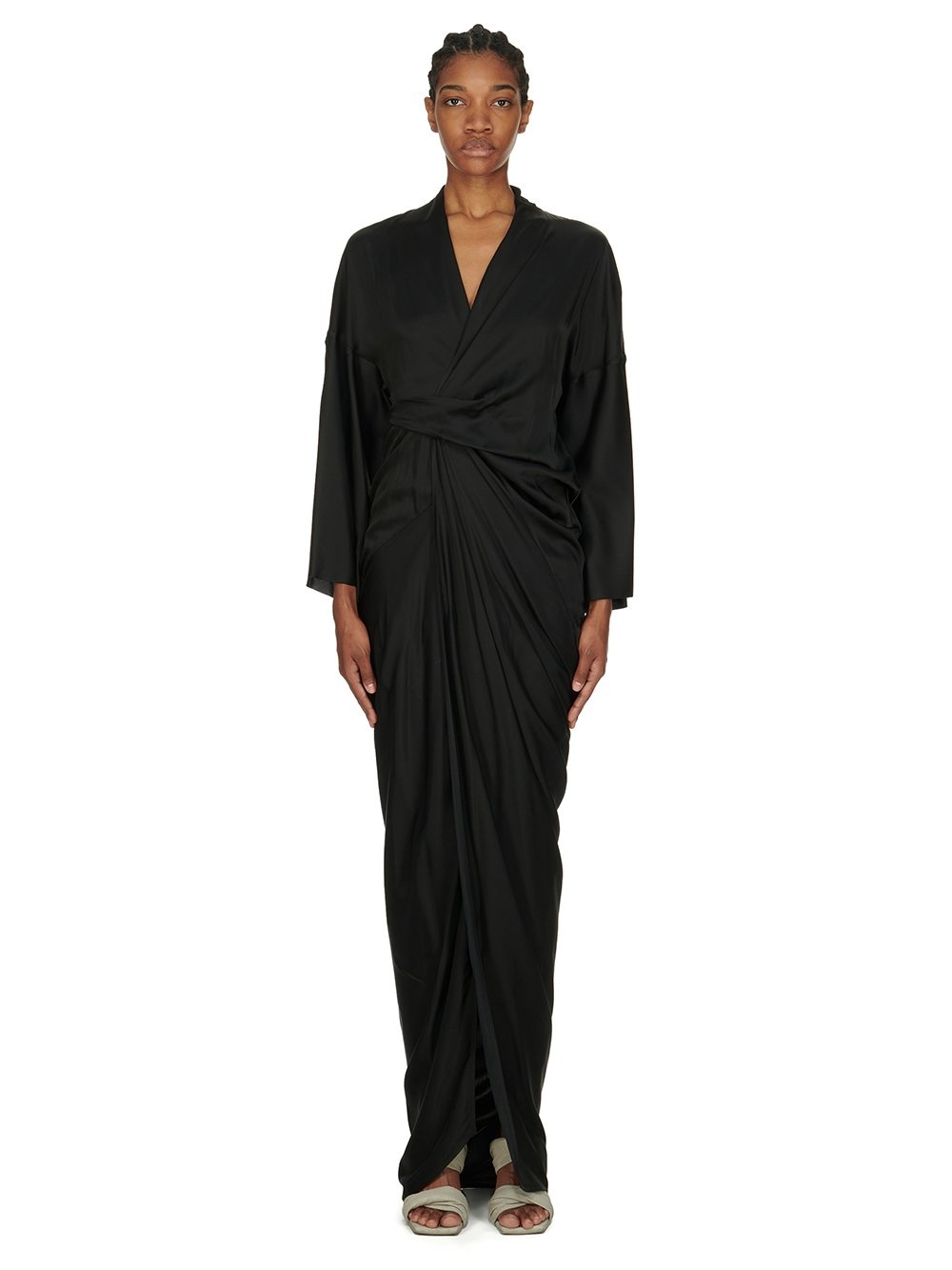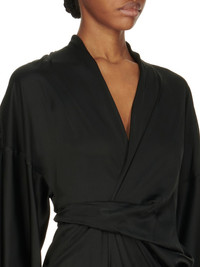 RICK OWENS FW24 PORTERVILLE WRAP GOWN IN BLACK WASHED CHARMEUSE THIS WRAP GOWN IS FLOOR LENGTH WITH 3/4 LENGTH SLEEVES. IT IS A WRAP DRESS THAT TIES WITH A BELT AT THE BACK, CREATING A V NECK AND A FRONT SPLIT, WITH DRAPING DETAILS AND PLEATS AROUND THE WAIST THIS LIGHTWEIGHT AND FLUID CHARMEUSE HAS A SEMI-SHINY SURFACE AND WASHED FINISH. THIS FABRIC IS MADE FROM CERTIFIED VISCOSE WHICH ENSURES THAT THE FIBERS ARE PRODUCED FROM RESPONSIBLY MANAGED SOURCES AND NO DEFORESTATION OCCURS COLOR: BLACK MATERIAL: 61% ACETATE + 39% VISCOSE MODEL IS 181CM TALL MODEL WEARS SIZE 40