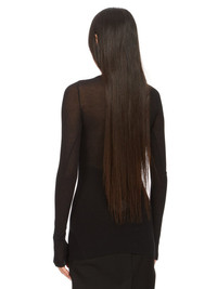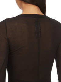 RICK OWENS FW24 PORTERVILLE RIB LS T IN BLACK VISCOSE SILK RIB JERSEY THIS RIB LS T IS BELOW HIP-LENGTH WITH A SLIM FIT AND LONG SLEEVES. IT HAS A RIBBED ROUND NECK, RAW CUT HEM AND CUFFS, AND FEATURES THE SIGNATURE SINGLE SEAM RUNNING DOWN CENTRE BACK SPINE THIS LIGHTWEIGHT VISCOSE AND SILK RIB JERSEY HAS A DISTINCT RIB PATTERN AND SOFT HANDFEEL.THIS JERSEY IS MADE FROM FSC® CERTIFIED VISCOSE WHICH ENSURES THAT THE FIBERS ARE PRODUCED FROM RESPONSIBLY MANAGED SOURCES AND NO DEFORESTATION OCCURS WE STRIVE TO KEEP OUR PRODUCTION AS LOCAL AS POSSIBLE. THE FULL MANUFACTURING CYCLE OF THIS PRODUCT, FROM THE MATERIAL KNITTING TO SEWING AND FINISHING, WAS UNDERTAKEN CLOSE TO OUR HOME BASE IN CONCORDIA, ITALY. - COLOR: BLACK - MATERIAL: 88% VISCOSE + 12% SILK - MODEL IS 181CM TALL - MODEL WEARS SIZE 40