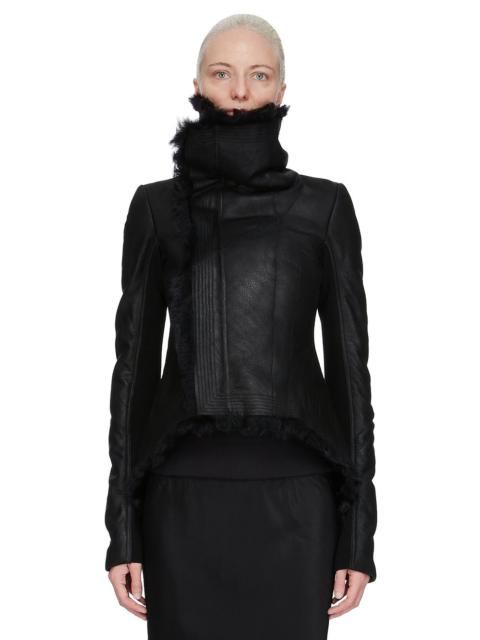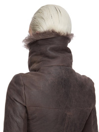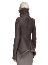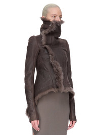 RICK OWENS FW25 CONCORDIANS NASKA BIKER IN DARKDUST TOSCANA SHEARLING THIS NASKA BIKER IS BELOW WAIST LENGTH, IT FEATURES A DOUBLE BREASTED FRONT WITH OFF CENTRE ZIPPER, CREATING A COVER FLAP WHICH CAN BE WORN OPEN AS AN EASY DRAPE, HALF-CLOSED AS A WIDE COLLAR OR FULLY ZIPPERED UP TO CREATE A HIGH FUNNEL NECK. IT HAS LONG SLEEVES, TOPSTITCHING ON SEAMS AND A CURVED NASKA HEMLINE THAT DIPS INTO TWO POINTS AT THE BACK THIS MEDIUMWEIGHT SHEARLING LAMB LEATHER HAS A WAXY NAPPA FINISH AND A SOFT, LONG AND CURLY FUR TANNED IN THE TUSCANY AREA OF ITALY, THESE SHEARLING HIDES ARE OF NORTH SPANISH ORIGIN. THE SPECIFIC CURLY AND LONG HAIR TEXTURE IS ONLY FOUND IN THE BURGOS REGION OF SPAIN. BECAUSE THE HAIR IS NATURAL, THERE WILL BE VARIATIONS IN HAIR LENGTH AND TEXTURE, MAKING EACH PIECE UNIQUE THIS TANNERY IS LWG CERTIFIED WITH A SILVER RATING COLOR: DARKDUST MATERIAL: 100% LAMB SHEARLING REAL FUR KNIT RIB UNDER SLEEVES 100% NEW WOOL ZIPPER EDGE 100% CALF LEATHER SLEEVES LINING 100% CUPRO MODEL IS 181CM TALL MODEL WEARS SIZE 40