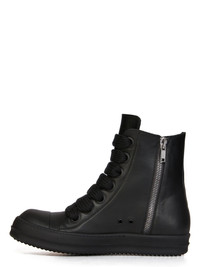 RICK OWENS SS24 LIDO JUMBO LACED SNEAKERS IN BLACK FULL GRAIN CALF LEATHER THESE JUMBO LACED SNEAKERS ARE ABOVE-ANKLE HEIGHT AND FEATURE EYELETS, JUMBO LACES, A ZIPPER ON THE INSIDE ANKLE FOR EASY FASTENING, TOE CAPS AND SHARK-TOOTH SOLES THIS MEDIUMWEIGHT FULL GRAIN CALF LEATHER HAS A FLAT AND MATTE SURFACE FINISH AND IS SPECIFICALLY TANNED FOR SHOES WITH AN ABRASION-RESISTANT FINISH- COLOR: BLACK/BLACK/BLACK/BLACK - MATERIAL: UPPER 100% COW LEATHER - TOE 100% CALF LEATHER - LINING 100% CALF LEATHER - INSOLE 100% CALF LEATHER - SOLE 100% THERMOPLASTIC RUBBER - SOLE AT HIGHEST POINT 6CM