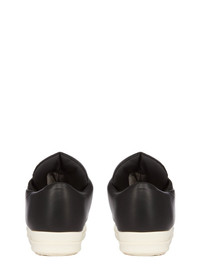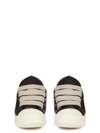 RICK OWENS SS25 HOLLYWOOD JUMBOLACED LOW SNEAKS IN BLACK/MILK/MILK PEACHED LAMBSKIN THESE JUMBOLACE LOW SNEAKS ARE UNDER-ANKLE HEIGHT AND FEATURE FOUR EYELETS, JUMBO LACES, TOE CAPS AND SHARK-TOOTHED BUMPER SOLES THIS LEATHER IS LIGHTWEIGHT AND HAS A SOFT NATURAL PEACHSKIN HANDFEEL LIGHTWEIGHT LAMB LEATHER LEFT AS NAKED AS POSSIBLE TO ACHIEVE A SOFT NATURAL PEACH SKIN TOUCH. THE SOFT HANDFEEL OF THIS LEATHER IS ACHIEVED BY TUMBLING THE SKINS MULTIPLE TIMES IN LARGE DRUMS AND AIR-DRYING WITHOUT ANY ADDED FINISHESTHIS TANNERY IS LWG AUDITED COLOR: BLACK/MILK/MILK MATERIAL: UPPER 100% LAMB LEATHERTOE 100% CALF LEATHERLINING 100% CALF LEATHER PADDING 96% POLYESTER + 4% NYLON INSOLE 100% CALF LEATHERSOLE 100% THERMOPLASTIC RUBBER