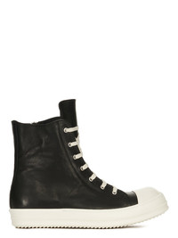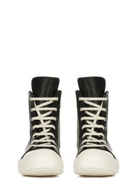 RICK OWENS FW24 PORTERVILLE SNEAKERS IN BLACK/MILK/MILK WASHED CALF THESE SNEAKERS ARE ABOVE-ANKLE HEIGHT AND FEATURE SEVEN EYELETS, LACES, A ZIPPER ON THE INSIDE ANKLE FOR EASY FASTENING, TOE CAPS AND SHARK TOOTHED BUMPER SOLES THIS MEDIUMWEIGHT COW LEATHER IS VEG TANNED AND FINISHED USING NATURAL WAXES. A FINAL WASH GIVES THIS LEATHER ITS SOFTNESS AND BRINGS OUT THE NATURAL GRAIN TEXTURE OF EACH SKIN. BECAUSE THIS SKIN IS NAKED, NOT FINISHED USING ANY PIGMENTS COVERING THE SKIN, NATURAL MARKINGS AND SHADINGS ARE VISIBLE WHICH MAKES EACH SKIN AND PRODUCT UNIQUE. VEG TANNING MEANS ONLY VEGETAL AND NATURAL TANNINS WERE USED IN THE PROCESS OF TANNING AND PRESERVING THIS LEATHER. - COLOR: BLACK/MILK/MILK - MATERIAL: UPPER 100% CALF LEATHER - TOE 100% CALF LEATHER - LINING 100% CALF LEATHER - INSOLE 100% CALF LEATHER - SOLE 100% THERMOPLASTIC RUBBER