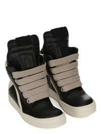 RICK OWENS FW25 CONCORDIANS JUMBOLACE GEOBASKET IN BLACK/MILK/MILK FULL GRAIN COW LEATHER THESE JUMBOLACE GEOBASKETS ARE ABOVE-ANKLE HEIGHT. THEY FEATURE AN EXTENDED TONGUE WITH WEBBING TAB, SIGNATURE GEOMETRIC PANELS AND A PADDED BACK COUNTER WITH LINES OF TOPSTITCHING. THEY HAVE JUMBO LACES, A ZIPPER ON THE INSIDE ANKLE FOR EASY FASTENING AND SHARK-TOOTHED BUMPER SOLES. THIS MEDIUMWEIGHT FULL GRAIN COW LEATHER HAS A FLAT AND MATTE SURFACE FINISH AND IS SPECIFICALLY TANNED FOR SHOES WITH AN ABRASION-RESISTANT FINISH THIS TANNERY IS LWG CERTIFIED WITH A BRONZE RATING COLOR: BLACK/MILK/MILK MATERIAL: UPPER 100% COW LEATHER LINING 100% CALF LEATHER INSOLE 100% CALF LEATHER SOLE 100% THERMOPLASTIC RUBBER SOLE HEIGHT 3.5CM