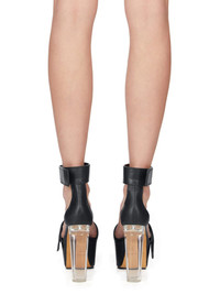 RICK OWENS FW24 PORTERVILLE STRAP SANDAL 65 IN BLACK WASHED CALF THESE STRAP SANDAL 65 ARE OPEN TOED WITH A STRAP RUNNING OVER THE TOE AND A SECOND AROUND THE ANKLE. THE STRAPS ARE ADJUSTABLE RUNNING THROUGH SQUARE METAL RINGS. THEY FEATURE A 12CM TRANSPARENT HEEL (6,5CM RISE) AND A THICK FRONT COVERED PLATFORM WITH A MINIMAL GRILL EMBOSSED DETAIL ON FRONT THIS MEDIUMWEIGHT COW LEATHER IS VEG TANNED AND FINISHED USING NATURAL WAXES. A FINAL WASH GIVES THIS LEATHER ITS SOFTNESS AND BRINGS OUT THE NATURAL GRAIN TEXTURE OF EACH SKIN. BECAUSE THIS SKIN IS NAKED, NOT FINISHED USING ANY PIGMENTS COVERING THE SKIN, NATURAL MARKINGS AND SHADINGS ARE VISIBLE WHICH MAKES EACH SKIN AND PRODUCT UNIQUE. VEG TANNING MEANS ONLY VEGETAL AND NATURAL TANNINS WERE USED IN THE PROCESS OF TANNING AND PRESERVING THIS LEATHER - COLOR: BLACK/CLEAR - MATERIAL: UPPER 100% CALF LEATHER - LINING 100% CALF LEATHER - INSOLE 100% CALF LEATHER - SOLE 100% COW LEATHER - SOLE DETAIL 100% THERMOPLASTIC POLYURETHANE