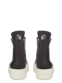 RICK OWENS FW24 PORTERVILLE MEGA BUMPER SNEAKS IN BLACK/MILK/MILK WASHED CALF THESE MEGA BUMPER SNEAKS ARE ABOVE-ANKLE HEIGHT AND FEATURE SEVEN EYELETS, LACES, A ZIPPER ON THE INSIDE ANKLE FOR EASY FASTENING, TOE CAPS AND DOUBLE HIGHT, MEGA BUMPER SHARK-TOOTH SOLES THIS MEDIUMWEIGHT COW LEATHER IS VEG TANNED AND FINISHED USING NATURAL WAXES. A FINAL WASH GIVES THIS LEATHER ITS SOFTNESS AND BRINGS OUT THE NATURAL GRAIN TEXTURE OF EACH SKIN. BECAUSE THIS SKIN IS NAKED, NOT FINISHED USING ANY PIGMENTS COVERING THE SKIN, NATURAL MARKINGS AND SHADINGS ARE VISIBLE WHICH MAKES EACH SKIN AND PRODUCT UNIQUE. VEG TANNING MEANS ONLY VEGETAL AND NATURAL TANNINS WERE USED IN THE PROCESS OF TANNING AND PRESERVING THIS LEATHER. - COLOR: BLACK/MILK/MILK - MATERIAL: UPPER 100% CALF LEATHER - TOE 100% CALF LEATHER - LINING 100% CALF LEATHER - INSOLE 100% CALF LEATHER - SOLE 100% THERMOPLASTIC RUBBER