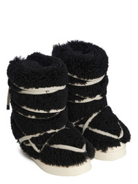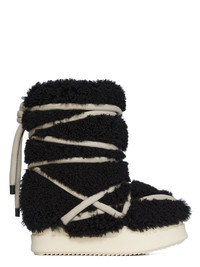 RICK OWENS FW25 CONCORDIANS MEGA BUMPER LUNAR IN BLACK/MILK CURLY SHEARLING THESE MEGA BUMPER LUNAR ARE ABOVE-ANKLE HEIGHT. THEY HAVE A SOFT PADDED PULL ON BOOT UPPER AND DOUBLE HEIGHT, SHARK-TOOTHED MEGA BUMPER SOLES THIS HEAVYWEIGHT SHEARLING LAMB LEATHER HAS A WAXY NAPPA FINISH AND A SOFT NATURAL FUR TANNED IN THE TUSCANY AREA OF ITALY, THESE SHEARLING MERINO HIDES ARE OF SPANISH ORIGIN, THE UNIQUE THICK FUR OF THESE ANIMALS MAKE THEM PERFECT FOR SHEARLING. BECAUSE THE HAIR IS NATURAL, THERE WILL BE VARIATIONS IN HAIR LENGTH AND TEXTURE, MAKING EACH PIECE UNIQUE THIS TANNERY IS LWG CERTIFIED WITH A SILVER RATING COLOR: BLACK/MILK MATERIAL: UPPER 100% LAMB SHEARLING REAL FUR LINING 100% NYLON PADDING 70% POLYURETHANE + 30% POLYESTER INSOLE 100% CALF LEATHER SOLE 100% THERMOPLASTIC RUBBER SOLE HEIGHT 4.5CM