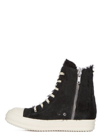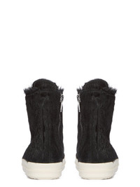 RICK OWENS FW23 LUXOR SNEAKERS IN BLACK AND MILK LONG HAIR PONY THESE SNEAKS ARE ABOVE-ANKLE HEIGHT AND FEATURE SEVEN EYELETS, LACES, A ZIPPER ON THE INSIDE ANKLE FOR EASY FASTENING, TOE CAPS AND SHARK-TOOTH SOLES THIS HEAVYWEIGHT LEATHER IS A HAIR-ON COWHIDE WITH NATURAL LENGTH COARSE HAIR. THIS LEATHER IS TANNED IN THE VENETO AREA OF ITALY BY A TANNERY SPECIALIZED IN HAIR-ON COW LEATHER. BECAUSE THE HAIR IS NATURAL THERE CAN BE INCONSISTENCY IN THE LENGTH DIRECTION, TEXTURE AND COLOR THIS TANNERY IS LWG CERTIFIED WITH A SILVER RATING. - COLOR: BLACK AND MILK - MATERIAL: UPPER 100% COW REAL FUR - TOE 100% CALF LEATHER - LINING 100% CALF LEATHER - INSOLE 100% CALF LEATHER - SOLE 100% THERMOPLASTIC RUBBER
