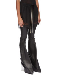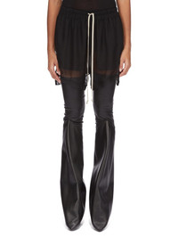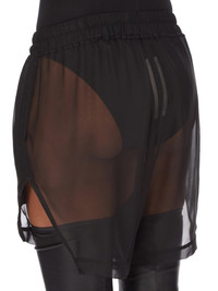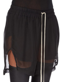 RICK OWENS SS25 HOLLYWOOD RUNWAY BOXERS IN BLACK SILK CHIFFON THESE BOXERS ARE KNEE-LENGTH. THEY HAVE AN ELASTICIZED WAISTBAND WITH DRAWSTRING, A SLIGHTLY DROPPED CROTCH, SIDE WELT POCKETS AND BEVELED SIDE SPLITS THIS LIGHTWEIGHT AND SEMI-TRANSPARENT SILK CHIFFON IS FLUID WITH A MATTE SURFACE AND DRY HANDFEEL. IT IS WOVEN IN THE COMO REGION OF ITALY KNOWN FOR ITS HERITAGE OF SILK PRODUCTION THIS FABRIC IS MADE USING GOTS CERTIFIED ORGANIC SILK BECAUSE IT MEANS THE NATURAL FIBER IS MADE WITHOUT HARMFUL CHEMICALS, WHICH LEAVES OUR SOIL, AIR AND WATER CLEANER FROM CONTAMINATES COLOR: BLACK MATERIAL: 100% SILK MODEL IS 181CM TALL MODEL WEARS SIZE 40