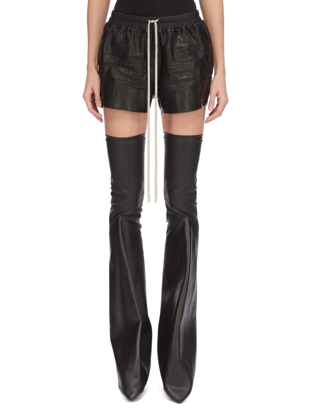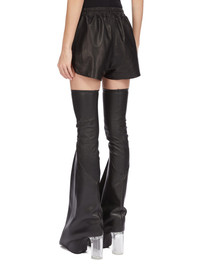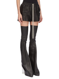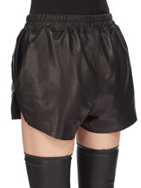 RICK OWENS SS25 HOLLYWOOD RUNWAY SHORT BOXERS IN BLACK WAXY LAMB LEATHER THESE BOXERS HIGH-THIGH LENGTH AT FRONT AND DIP LOWER AT BACK. THEY HAVE AN ELASTICIZED WAISTBAND WITH DRAWSTRING, A SLIGHTLY DROPPED CROTCH, SIDE WELT POCKETS AND BEVELED SIDE SPLITS THIS LIGHTWEIGHT LAMB LEATHER IS FINISHED USING NATURAL WAXES AND ANILINE WHICH MAKES A SUPPLE HANDFEEL. BECAUSE THIS SKIN IS NAKED, NOT FINISHED USING ANY PIGMENTS COVERING THE SKIN, NATURAL MARKINGS AND SHADINGS ARE VISIBLE WHICH MAKES EACH SKIN AND PRODUCT UNIQUE. THIS TANNERY IS LWG AUDITED COLOR: BLACK MATERIAL: 100% LAMB LEATHER MODEL IS 181CM TALL MODEL WEARS SIZE 40