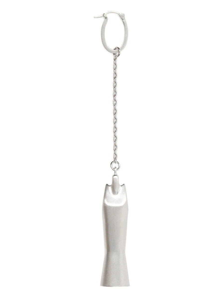 RICK OWENS SS26 TEMPLE RUNWAY SISTER EARRING IN BRASS THIS SISTER EARRING FEATURES A REPLICA OF THE TEMPLE STATUES PLACED OUTSIDE THE MUSEE GALLIERA IN PARIS AS PART OF THE RICK OWENS RETROSPECTIVE EXHIBITION "TEMPLE OF LOVE". IT HAS A SMALL 24 LINK CHAIN ATTACHED TO THE TOP OF THE SISTER CHARM AT ONE END AND TO THE EARRING CLIP AT THE OTHER. THIS JEWELRY PIECE HAS A SEMI-SHINY BRUSHED PALLADIUM FINISH. COLOR: PALLADIUM MATERIAL: 100% BRASS