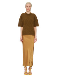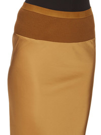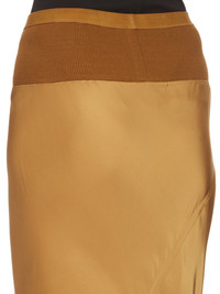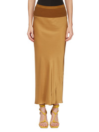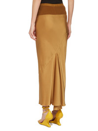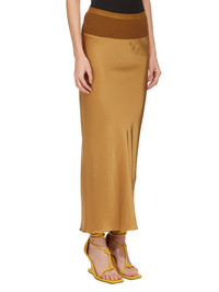 RICK OWENS FW24 PORTERVILLE CALF BIAS SKIRT IN HONEY WASHED CHARMEUSE THIS CALF BIAS SKIRT IS LOW-CALF LENGTH WITH A WIDE RIBBING AND ELASTICIZED WAISTBAND. IT FLARES SLIGHTLY FROM THE KNEE AND FEATURES A DIAGONAL BIAS CUT SEAM WITH DRAPED INSERT AT LEFT BACK THIS LIGHTWEIGHT AND FLUID CHARMEUSE IS HAS A SEMI-SHINY SURFACE AND WASHED FINISH. THIS FABRIC IS MADE FROM FSC® CERTIFIED VISCOSE WHICH ENSURES THAT THE FIBERS ARE PRODUCED FROM RESPONSIBLY MANAGED SOURCES AND NO DEFORESTATION OCCURS - COLOR: HONEY - MATERIAL: 61% ACETATE + 39% VISCOSE - BAND 65% COTTON + 35% NYLON - MODEL IS 181CM TALL - MODEL WEARS SIZE 40