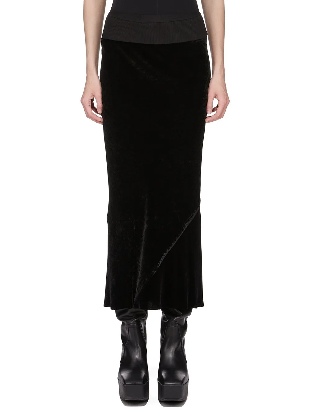 RICK OWENS FW25 CONCORDIANS CALF BIAS SKIRT IN BLACK VELVET THIS CALF BIAS SKIRT IS LOW-CALF LENGTH WITH A WIDE RIBBING AND ELASTICIZED WAISTBAND. IT FLARES SLIGHT FROM THE KNEE FEATURES A DIAGONAL BIAS CUT SEAM WITH DRAPED INSERT AT LEFT BACK THIS LIGHTWEIGHT AND FLUID VELVET HAS A SOFT AND WASHED UNEVEN FINISH THIS FABRIC IS MADE FROM FSC® CERTIFIED VISCOSE WHICH ENSURES THAT THE FIBERS ARE PRODUCED FROM RESPONSIBLY MANAGED SOURCES AND NO DEFORESTATION OCCURS COLOR: BLACK MATERIAL: 82% VISCOSE + 18% SILK BAND 65% COTTON + 35% NYLON MODEL IS 181CM TALL MODEL WEARS SIZE 40