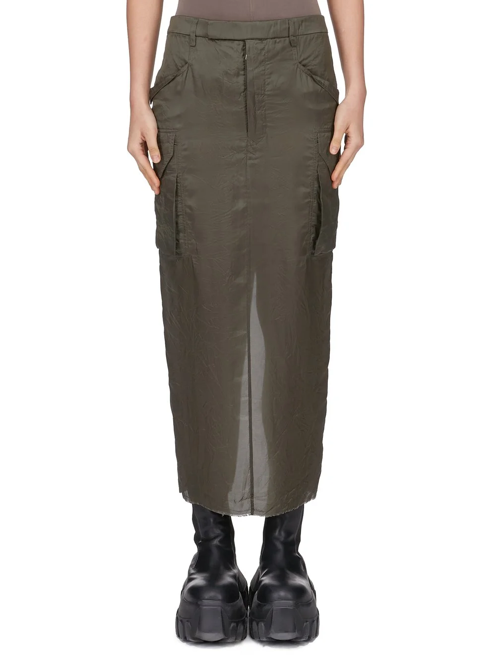 RICK OWENS FW25 CONCORDIANS FIRBANKS SKIRT IN BOSCO CUPRO TWILL THIS FIRBANKS SKIRT IS MID-CALF LENGTH WITH TOP FRONT MASTODON POCKETS, AND TWO LARGE LOWER THIGH CARGO POCKETS WITH FLAPS. IT FEATURES A WAISTBAND WITH CONCEALED FRONT ZIPPER AND BELT LOOPS, SIDE POCKETS AND BACK POCKETS WITH BUTTONS. THIS VERSION HAS A RAW CUT HEM THIS LIGHTWEIGHT AND FLUID CUPRO TWILL HAS A GLOSSY SURFACE AND A SOFT, WASHED HANDFEEL THIS FABRIC IS MADE USING CUPRO WHICH IS BIODEGRADABLE AND 100% PLANT BASED. AS IT’S MADE FROM COTTON WASTE, CUPRO HELPS FIND A PURPOSE TO FIBERS THAT WOULD OTHERWISE BE DISCARDED COLOR: BOSCO MATERIAL: 100% CUPRO BUTTONS 100% BUFFALO HORN MODEL IS 181CM TALL MODEL WEARS SIZE 40