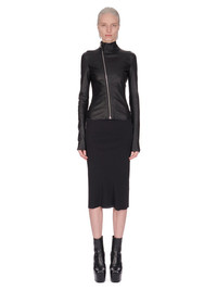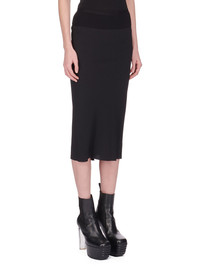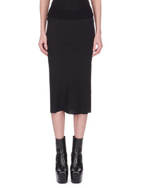 RICK OWENS SS24 LIDO KNEE BIAS SKIRT IN BLACK COCOON CREPE THIS KNEE BIAS SKIRT IS BELOW KNEE LENGTH, WITH A WIDE RIBBING AND ELASTICIZED WAISTBAND. IT FEATURES A DIAGONAL BIAS CUT SEAM WITH DRAPED INSERT AT MID BACK THIS LIGHTWEIGHT AND FLUID SILK BLEND CREPE HAS A DRY AND MATTE FINISH. IT IS WOVEN IN THE COMO REGION OF ITALY KNOWN FOR ITS HERITAGE OF SILK PRODUCTION THIS FABRIC IS MADE FROM FSC® CERTIFIED ACETATE WHICH ENSURES THAT THE FIBERS ARE PRODUCED FROM RESPONSIBLY MANAGED SOURCES AND NO DEFORESTATION OCCURS - COLOR: BLACK - MATERIAL: 64% ACETATE + 36% SILK - BAND 70% COTTON + 30% NYLON - MODEL IS 181CM TALL - MODEL WEARS SIZE 40