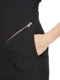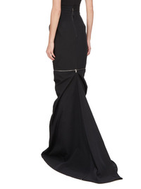RICK OWENS SS25 HOLLYWOOD RUNWAY HEADON SKIRT IN BLACK POLY COTTON CANVAS THIS HEADON SKIRT TRAILS FLOOR LENGTH, WITH A TIGHT FIT. IT HAS AN EXTRA HIGH WAIST WITH WAISTBAND BACK ZIPPER, SIDE FRONT POCKETS AND A TAPERED SKIRT THAT FLARES FROM THE KNEE WITH A GODET IN THE CENTRE BACK SEAM. IT HAS DIAGONAL ZIPPERED POCKETS ON THE FRONT HIP, AND VERTICAL UTILITY POCKETS. IT HAS AN MID-THIGH ZIPPER THAT CAN BE UNZIPPED TO REMOVE THE BOTTOM HALF OF THE SKIRT. IT ALSO FEATURES AN ARCED ZIPPER IN THE FRONT HEM ALLOWING THE CENTRE PART TO BE REMOVED, REVEALING THE SHINS AND FEET THIS MEDIUMWEIGHT COTTON AND POLYESTER CANVAS HAS A VISIBLE CANVAS STRUCTURE AND A DRY HANDFEEL. THE FABRIC HAS MINIMAL FINISHING IN ORDER TO KEEP THE NATURAL CHARACTERISTICS OF THE COTTON YARN THIS FABRIC IS MADE USING GRS CERTIFIED RECYCLED POLYESTER WHICH ENSURES A REDUCTION IN WATER CONSUMPTION, EMISSIONS AND HAZARDOUS WASTE, LESSENING THE DEPENDENCE ON NON-RENEWABLE RESOURCES THIS FABRIC WAS WOVEN ON A 1950’S VINTAGE SHUTTLE LOOM BY BONOTTO, A 4TH GENERATION TEXTILE MILL FOUNDED IN 1912 SITUATED JUST BELOW THE PREALPS IN VENETO, ITALY COLOR: BLACK MATERIAL: 30% COTTON LINING 100% CUPRO MODEL IS 181CM TALL MODEL WEARS SIZE 38