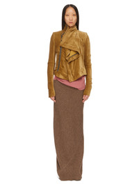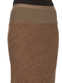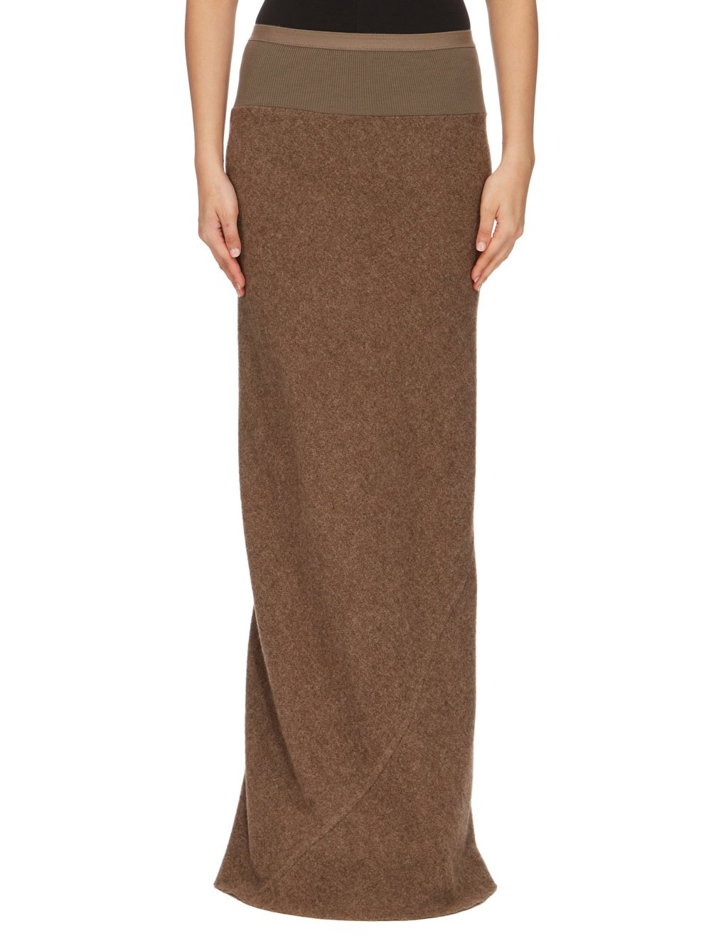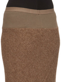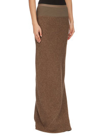 RICK OWENS FW24 PORTERVILLE LONG CODA IN FAWN LODENETTE THIS LONG CODA SKIRT IS FLOOR LENGTH WITH A WIDE RIBBING AND ELASTICIZED WAISTBAND. IT FALLS IN A SLIM COLUMN TO THE FLOOR AND FEATURES A DIAGONAL BIAS CUT SEAM WITH DRAPED INSERT AT MID-BACK THIS HEAVYWEIGHT PURE WOOL FABRIC HAS A BRUSHED AND SOFT HANDFEEL. IT IS WOVEN BY 5TH GENERATION FAMILY OWNED MILL IN AUSTRIA FOUNDED IN 1888 THAT SPECIALIZES IN MAKING HEAVY WOOL COAT FABRICS TO BE WORN DURING THE ALPINE WINTERS. ONLY PURIFIED GLACIER WATER FROM THE DACHSTEIN GLACIER IS USED TO TREAT THIS FABRIC. THE WOOL USED IN THIS QUALITY IS MULESING FREE. THIS MELANGE FAWN COLOR IS ACHIEVED BY MIXING DIFFERENT NATURAL WOOL TONES. - COLOR: FAWN - MATERIAL: 100% NEW WOOL - BAND 65% COTTON + 35% NYLON - MODEL IS 181CM TALL - MODEL WEARS SIZE 40