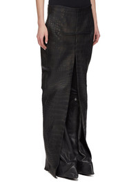 RICK OWENS FW25 CONCORDIANS RUNWAY SLICED SKIRT IN BLACK WAXY ALLIGATOR THIS SLICED SKIRT IS FLOOR LENGTH AT SIDES. IT HAS A CENTRE BACK ZIPPER AND A CLOSE TO THE BODY FIT. IT FEATURES TWO HIGH SLITS FRONT AND BACK AS WELL AS A FRONT AND BACK STITCH RIDGE DETAIL. IT HAS SIDE SEAM POCKETS. THIS GENUINE ALLIGATOR LEATHER IS SOFT WITH A WAXY HANDFEEL CAPTURED IN THE WILD IN THE AMERICAN SOUTH THIS JUMBO SCALE ALLIGATOR IS DYED BLACK AND DRUMMED WITH WAX TO ACHIEVE THE SOFT AND GREASY HANDFEEL SCALE TEXTURE AND PATTERN AS WELL AS MARKINGS AND SCRATCHES ARE NATURAL TO THE ANIMAL, THEY ARE SIGNS OF A LONG LIFE IN THE WILD AND WHAT MAKES EACH PIECE UNIQUE ALLIGATOR IS PROTECTED BY CITES COLOR: BLACK MATERIAL:100% ALLIGATOR LEATHER MODEL IS 181CM TALL MODEL WEARS SIZE 38