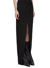 RICK OWENS FW25 CONCORDIANS RUNWAY SLICED SKIRT IN BLACK WOOL DRILL THIS SLICED SKIRT IS FLOOR LENGTH AT SIDES. IT HAS A CENTRE BACK ZIPPER AND A CLOSE TO THE BODY FIT. IT FEATURES TWO HIGH SLITS FRONT AND BACK AS WELL AS A FRONT AND BACK STITCH RIDGE DETAIL. IT HAS SIDE SEAM POCKETS. THIS MEDIUMWEIGHT WOOL DRILL FABRIC HAS A DISTINCT DRILL TEXTURE AND A DRY HANDFEEL THIS FABRIC IS MADE FROM RWS CERTIFIED VIRGIN WOOL WHICH ENSURES A HIGH STANDARD IN ANIMAL WELFARE, ENVIRONMENTAL SUSTAINABILITY AND SOCIAL RESPONSIBILITY. EACH BALE OF WOOL IS TRACEABLE BACK TO ITS SOURCE COLOR: BLACK MATERIAL: 100% WOOL MODEL IS 181CM TALL MODEL WEARS SIZE 38