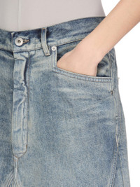 RICK OWENS FW25 CONCORDIANS LONG SLIVERED SKIRT IN DIRTY HUSTLER 14OZ SLUB DENIM THIS SLIVERED SKIRT IS AN ANKLE LENGTH 5 POCKET JEAN SKIRT. IT HAS A WAISTBAND WITH CONCEALED ZIP FLY, TOP BUTTON AND BELT LOOPS WITH RIVETS. IT PEAKS SLIGHTLY BETWEEN THE LEGS, TAPERING TO POINTS AT THE KNEE, AND FEATURES ANGULAR GEO PANELS ON THE FRONT THIGHS. THIS MEDIUMWEIGHT HUSTLER DENIM IS MADE ON A 14OZ JP INDIGO AND NATURAL SLUB DENIM. THE READY GARMENT IS STONE WASHED WITH MINERAL DYES TO ACHIEVE THE HUSTLER WASH. THIS FABRIC IS MADE USING GOTS CERTIFIED ORGANIC COTTON WHICH MEANS THE NATURAL FIBER IS GROWN WITHOUT HARMFUL CHEMICALS, LEAVING OUR SOIL, AIR AND WATER CLEANER FROM CONTAMINATES. THIS GARMENT IS TREATED IN AN ITALIAN WASH HOUSE BASED IN THE VENETO AREA OF ITALY, THAT PRODUCES IN SMALLER TREATMENT BATHS TO REDUCE WATER WASTE AND UTILIZE A WATER PURIFYING PROCESS THAT ENABLES THEM TO RECYCLE A PORTION OF THE WATER USED. ALL OF OUR DENIM WASHES ARE ZDHC CERTIFIED. COLOR: DIRTY HUSTLER MATERIAL: 100% COTTON POCKETS LINING 52% POLYESTER + 48% COTTON MODEL IS 181CM TALL MODEL WEARS SIZE 26