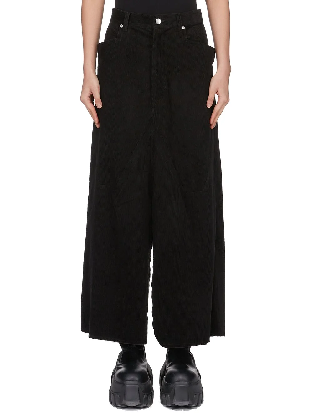 RICK OWENS FW25 CONCORDIANS LONG SLIVERED SKIRT IN BLACK LINEN CORDUROY THIS SLIVERED SKIRT IS AN ANKLE LENGTH 5 POCKET JEAN SKIRT. IT HAS A WAISTBAND WITH CONCEALED ZIP FLY, TOP BUTTON AND BELT LOOPS WITH RIVETS. IT PEAKS SLIGHTLY BETWEEN THE LEGS, TAPERING TO POINTS AT THE KNEE, AND FEATURES ANGULAR GEO PANELS ON THE FRONT THIGHS THIS MEDIUMWEIGHT COTTON AND LINEN BLEND CORDUROY HAS A SOFT HANDFEEL THE COLOR OF THIS CORDUROY IS NATURAL WITH SLUBS AND IMPURITIES VISIBLE AS A PART OF THE COLORATION THIS FABRIC IS MADE USING GOTS CERTIFIED ORGANIC COTTON WHICH MEANS THE NATURAL FIBER IS GROWN WITHOUT HARMFUL CHEMICALS, LEAVING OUR SOIL, AIR AND WATER CLEANER FROM CONTAMINATES COLOR: BLACK MATERIAL: 74% COTTON + 26% LINEN MODEL IS 181CM TALL MODEL WEARS SIZE 26