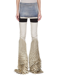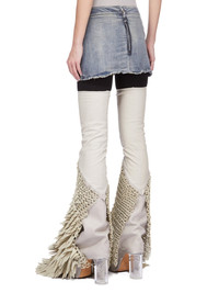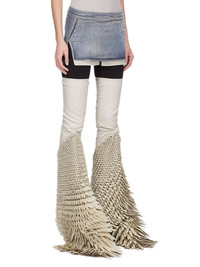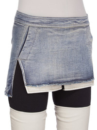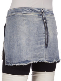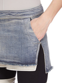 RICK OWENS FW25 CONCORDIANS FOG CUTOFF MINI IN DIRTY HUSTLER STRETCH DENIM THIS FOG CUTOFF MINI FINISHES HIGH ON THE THIGH AND IS TIGHT FITTING. IT HAS A HIGH WAIST AND CENTRE BACK ZIP CLOSURE. IT FEATURES VISIBLE POCKET BAGS THAT HANG BELOW THE FRONT HEM OF THE SKIRT THIS LIGHTWEIGHT HUSTLER DENIM IS MADE ON A 10OZ INDIGO AND NATURAL STRETCH DENIM. THE READY GARMENT IS STONE WASHED WITH MINERAL DYES TO ACHIEVE THE HUSTLER WASH THIS GARMENT IS TREATED IN AN ITALIAN WASH HOUSE BASED IN THE VENETO AREA OF ITALY, THAT PRODUCES IN SMALLER TREATMENT BATHS TO REDUCE WATER WASTE AND UTILIZE A WATER PURIFYING PROCESS THAT ENABLES THEM TO RECYCLE A PORTION OF THE WATER USED. ALL OF OUR DENIM WASHES ARE ZDHC CERTIFIED COLOR: DIRTY HUSTLER MATERIAL: 91% COTTON + 6% ELASTOMULTIESTER + 3% RUBBER FIBER POCKETS LINING 52% POLYESTER + 48% COTTON MODEL IS 181CM TALL MODEL WEARS SIZE 40
