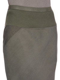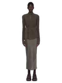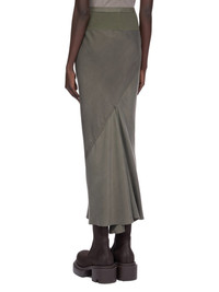 RICK OWENS FW25 CONCORDIANS CALF BIAS SKIRT IN BOSCO WASHED CUPRO THIS CALF BIAS SKIRT IS LOW-CALF LENGTH WITH A WIDE RIBBING AND ELASTICIZED WAISTBAND. IT FLARES SLIGHT FROM THE KNEE FEATURES A DIAGONAL BIAS CUT SEAM WITH DRAPED INSERT AT LEFT BACK THIS MEDIUMWEIGHT WASHED CUPRO SATIN IS FLUID AND FINISHED WITH ENZYMES WHICH GIVES THIS FABRIC ITS PEACH HANDFEEL THIS FABRIC IS MADE USING CUPRO WHICH IS BIODEGRADABLE AND 100% PLANT BASED. AS IT’S MADE FROM COTTON WASTE, CUPRO HELPS FIND A PURPOSE TO FIBERS THAT WOULD OTHERWISE BE DISCARDED COLOR: BOSCO MATERIAL: 100% CUPRO BAND 65% COTTON + 35% NYLON MODEL IS 181CM TALL MODEL WEARS SIZE 40